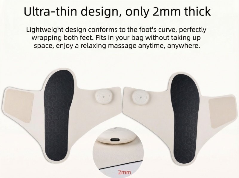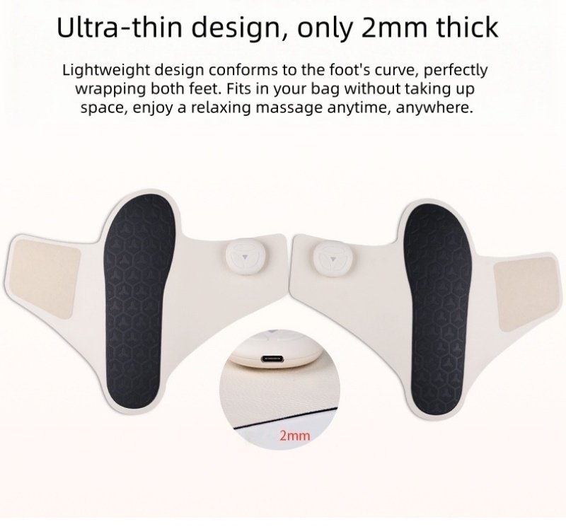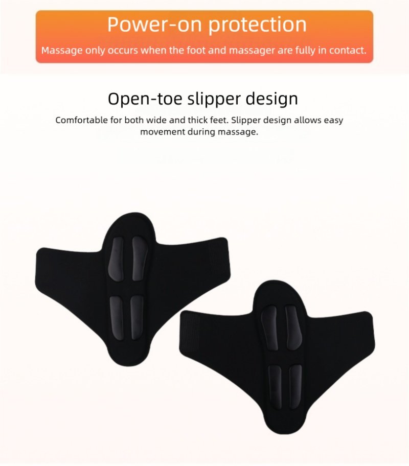 - EMS: Uses gentle electrical impulses to stimulate muscle contractions in the feet and lower legs, helping to strengthen muscles, improve circulation, and reduce muscle fatigue. It mimics natural movement to “exercise” foot muscles while you relax.